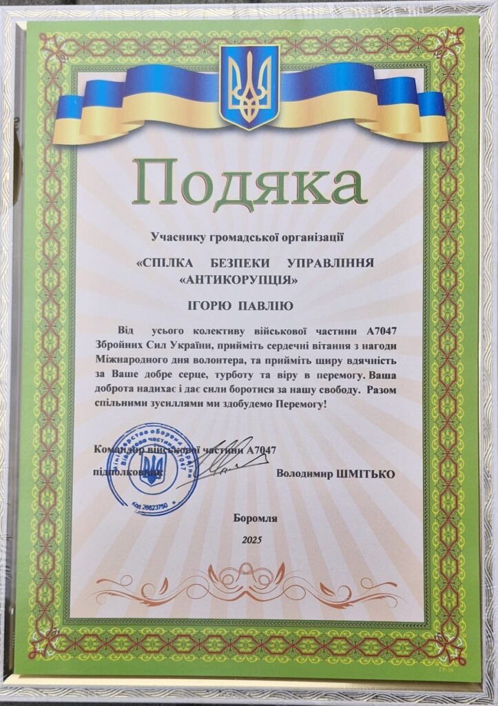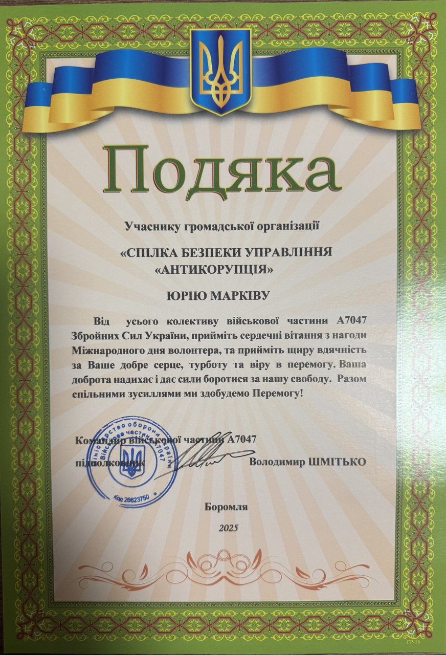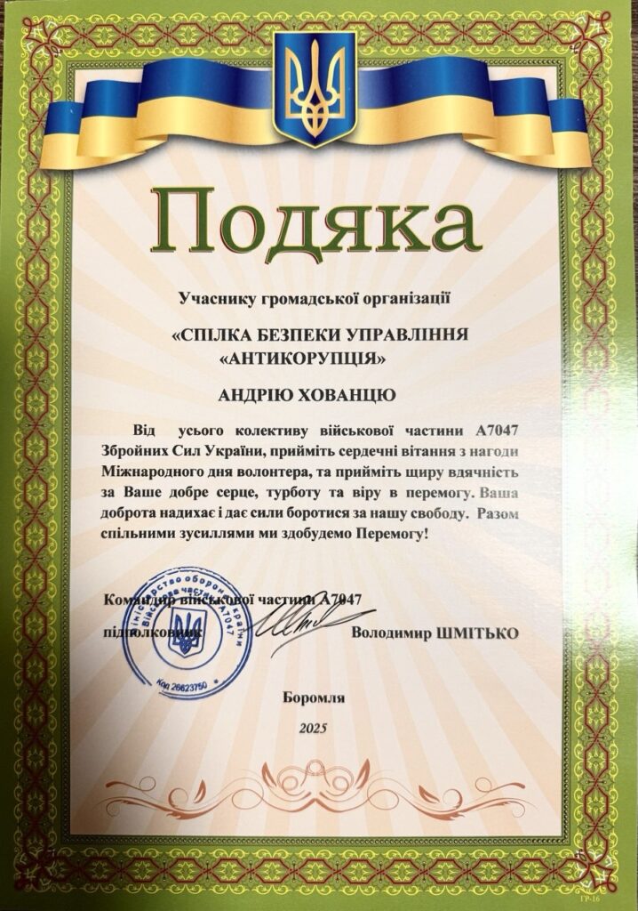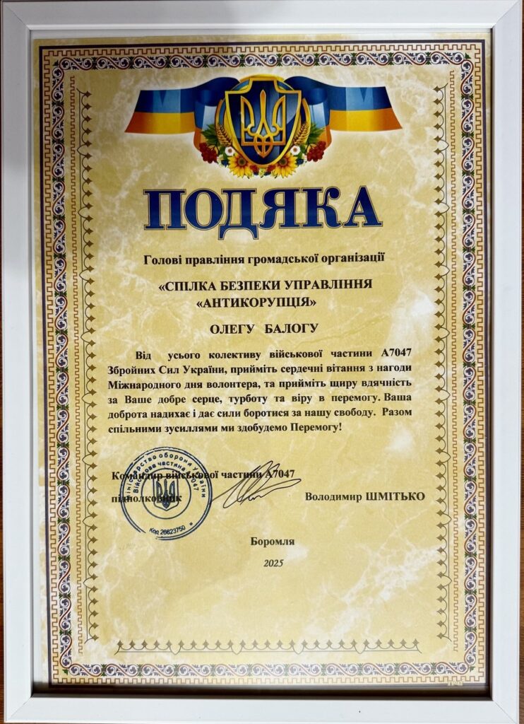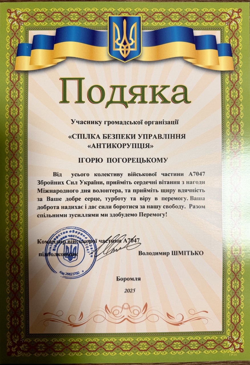На цій сторінці ви можете ознайомитися з деякими подяками, грамотами й нагородами, отриманими нашою Організацією, її членами та волонтерами: